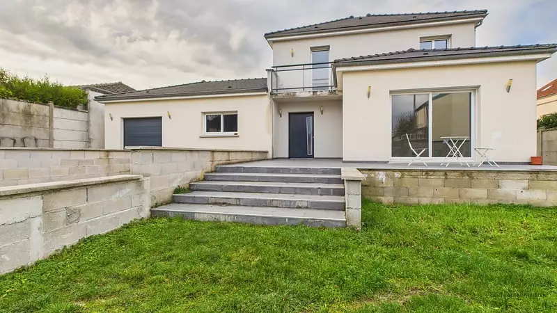 Maison comprenant : entrée de 12.60m² carrelée avec grand placard, cuisine de 12.30m² aménagée équipée carrelée semi ouverte sur salle à manger de 13.40m² avec baie vitrée, séjour salon de 30.70m² carrelé avec porte fenêtre accès jardin, suite parentale de 18.30m² avec salle d'eau carrelée faïencée de 4.60m² et dressing, bureau de 6.30m² carrelé, chambre de 18.50m² moquettée, wc carrelé, buanderie carrelée. À l'étage : palier carrelé, 3 chambres de 9.30m² à 11.50m² dont une avec balcon et une avec grand placard, salle de bains de 8.50m² avec wc. Chauffage central gaz de ville (au sol pour le rez de chaussée). Double vitrage. Volets roulants électriques. Terrasse. Sous sol total avec porte de garage motorisé. Terrain clos de 820m².