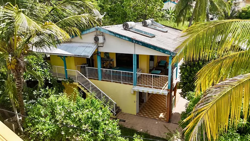 - À l'étage, un T4 vous attend avec trois chambres, dont une suite parentale avec salle d'eau privative, une deuxième salle d'eau, un séjour, une cuisine, et deux terrasses, dont l'une avec carbet donnant sur un vaste espace de vie extérieur aménagé de façon conviviale.