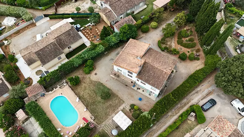 A vendre - Maison de 166m² type T6, piscine, garage, beau jardin. A seulement 1 km du centre du village, découvrez cette villa traditionnelle située au calme, implantée sur un terrain plat de 1 500 m², bénéficiant du canal d'arrosage et d'une piscine. Rez-de-jardin T2 : Une entrée avec accès direct au garage (doté d'une fosse idéale pour la mécanique) et à l'escalier montant vers le T4. Un couloir dessert une pièce indépendante, une salle d'eau, un WC séparé, une cuisine ouverte sur le côté piscine, un salon ainsi qu'une chambre. Possibilité de le transformer en T3. Étage T4: Un appartement T4 comprenant une cuisine indépendante, un vaste séjour traversant ouvrant sur deux terrasses avec vue dégagée, puis un espace nuit avec trois chambres, une salle de bains et un WC. Les deux niveaux sont reliés par un escalier intérieur, mais chacun dispose également de son accès extérieur indépendant : la séparation en deux logements est donc très simple à envisager. L'ensemble demande une mise au goût du jour, mais offre de très beaux atouts : volumes confortables, deux habitations distinctes, environnement calme et proximité des commodités. Prestations : tout-à-l'égout, volets roulants électriques, menuiseries PVC double vitrage, chauffage au fioul avec chaudière récente. Un bien idéal pour un projet familial, un investissement locatif ou une résidence principale modulable selon vos besoins. (3.18 % honoraires TTC à la charge de l'acquéreur.)