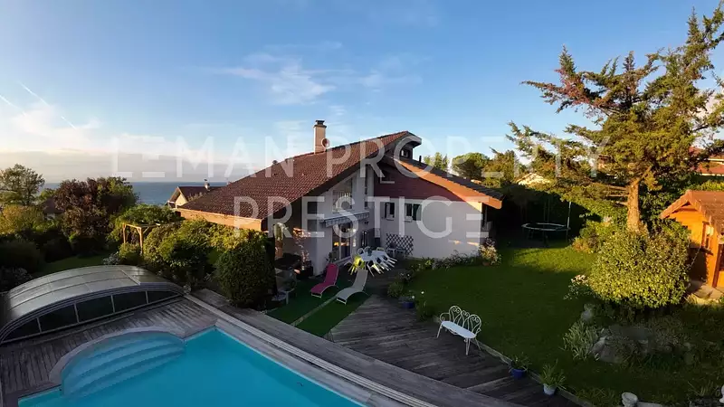 Venez découvrir avec votre partenaire Léman Property Prestige cette lumineuse maison d'architecte non mitoyenne pensée pour vivre dedans comme dehors, nombreuses ouvertures laissant place à la clarté et à la VUE LAC, édifiée sur un beau terrain paysagé de 1600m2 environ avec PISCINE couverte. Agencement fonctionnel pour une famille, rez-de-chaussée consacré aux pièces de vie avec séjour cathédrale, cheminée, cuisine équipée avec remise le tout avec accès direct sur TERRASSES et JARDIN fleuri. En demi niveau : 3 chambres avec rangements, salle de bains. Second niveau dédié à la suite parentale ainsi qu'une mezzanine pour bureau ou salon .. Sous sol partiel avec chaufferie, garage, cave à vins, stockage. Emplacement de qualité au calme absolu, un bel écrin rare sur le secteur ! A découvrir sans attendre !