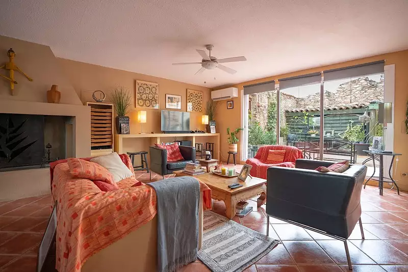 L'entrée extérieure est aussi unique que son intérieur spacieux. Le séjour est agrémenté d'une cheminée monumentale et baigné de lumière par des fenêtres orientées est et ouest. De grandes portes-fenêtres coulissantes s'ouvrent directement sur la terrasse, créant un espace chaleureux avec en toile de fond les murs en marbre et en pierre apparente.