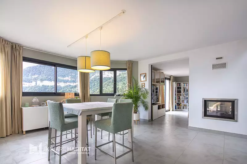 Noyarey, Route d'Ezy, Maison individuelle , Visite virtuelle disponible Cette villa contemporaine de 167 m² construite en 2012 sur une parcelle de 1600m² et divisée en deux logements, offre une magnifique vue sur la vallée de Grenoble. Rez-de-jardin : Un appartement T2 de 44 m² comprenant séjour-cuisine (aménagée et équipée) avec terrasse de 15 m² exposée Sud, une chambre et une salle d'eau avec WC. Un Garage de 33 m² avec porte motorisée, point d'eau et électricité, buanderie/chaufferie. 1er étage : Une belle pièce de vie lumineuse avec cuisine ouverte aménagée et équipée ayant accès à une cuisine d'été et terrasse de 16 m² orientée Sud/Est avec vue dégagée. Un hall d'entrée avec placard mural et des WC avec lave-mains. Ce niveau est accessible par l'extérieur ou par un escalier intérieur depuis le garage et le T2. 2ème étage : Un couloir dessert 3 chambres avec placards intégrés, dont une suite parentale avec salle d'eau privative, dressing et balcon de 5 m² exposé Sud/Est. Une Salle de bains avec sauna et espace jacuzzi avec puits de lumière et vue exceptionnelle sur Grenoble, WC. Extérieurs : Stationnement pour 3 véhicules, espace vert, potager et poulailler. Informations complémentaires : - Aucun travaux à prévoir - Chauffage par pompe à chaleur (plancher chauffant + radiateurs) et cheminée bois double face - VMC double flux, volets roulants électriques, porte renforcée 3 points - Assainissement individuel (microstation d'épuration + puits perdu) - Taxe foncière 2025 : 2 616 euros Les atouts : Vue dégagée sur la vallée grenobloise, excellente luminosité, prestations haut de gamme, faible consommation énergétique, maison clés en main, bien rare sur le secteur. Pour plus d'informations, prenez contact avec votre Agence Square Habitat Fontaine 04X76X26X92X92 ou au 06X26X43X24X88.
