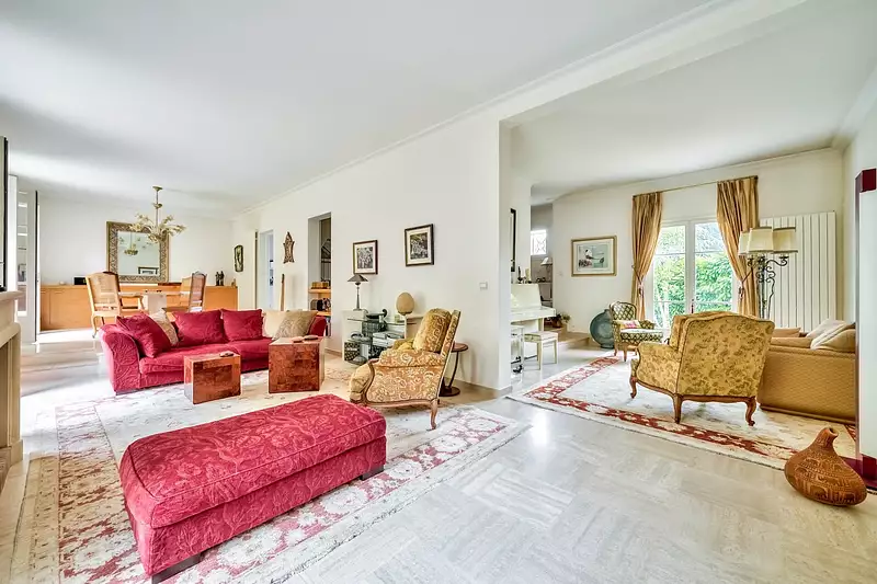 La distribution du rez-de-chaussée permet une circulation autour du hall de réception, du triple séjour lumineux à la cuisine, parfaite pour les cordons bleus. Toutes les pièces sont ouvertes sur le jardin par de large portes-fenêtres et bénéficient d'une belle hauteur sous plafond. À l'étage, les quatre chambres et deux salles de bains se répartissent autour d'une coursive, chaque chambre est dotée d'un placard aménagé.