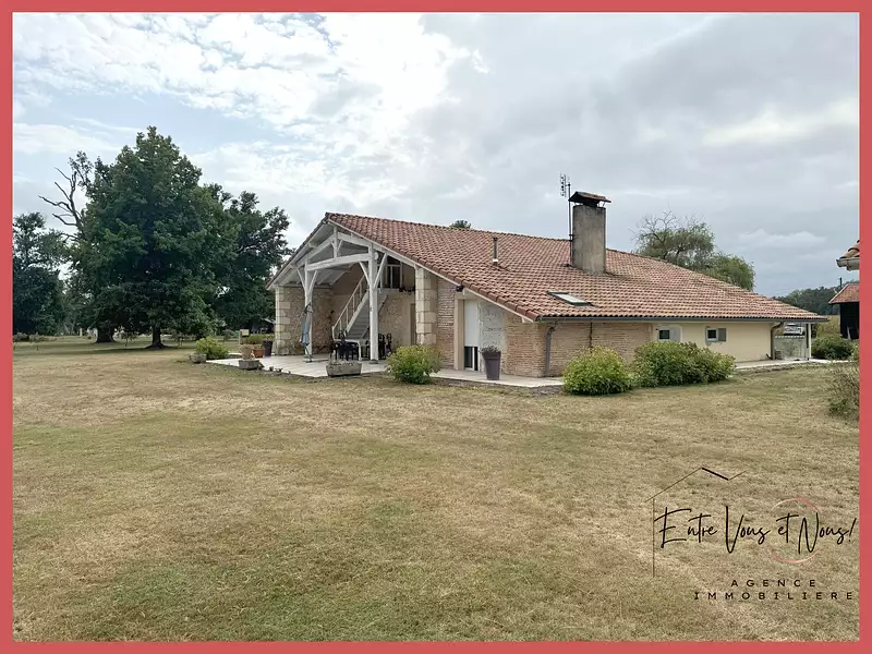 Chez ENTRE VOUS ET NOUS votre agence immobilière de Bazas, découvrez en lisière de forêt cette authentique landaise en pierre du XIXe rénovée et son parc d'environ 3 hectares parsemé de chênes dont certains sont centenaires.