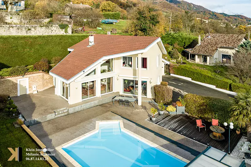 MAISON D'ARCHITECTE D'EXCEPTION A CLAIX Le cabinet Klein vous propose cette superbe maison d'architecte construite en 1999, située sur les hauteurs de Claix, dans un environnement paisible en pleine nature. Cette propriété unique offre une vue sur les montagnes environnantes, tout en étant idéalement placée à seulement cinq minutes du village et de toutes les commodités. D'une surface habitable de 168 m², cette maison lumineuse et spacieuse se compose de cinq pièces. Le coeur de la maison est un vaste séjour doté d'un plafond cathédrale impressionnant de 7,30 mètres de hauteur et d'une superbe cheminée qui apportent une sensation d'espace et d'élégance. Les grandes baies vitrées inondent la pièce de lumière naturelle tout en offrant une vue dégagée sur l'extérieur. La cuisine, récemment rénovée et équipée par Mobalpa, allie design moderne et fonctionnalité. Les espaces nuit comprennent trois belles chambres, dont deux suites parentales à l'étage, chacune avec leur propre salle de bains. Une troisième salle de bains complète également les installations pour un confort optimal. A l'extérieur, le terrain de 1 101 m² est aménagé pour profiter pleinement de chaque saison. Une piscine avec abri est entourée d'une grande terrasse en résine, idéale pour se détendre ou recevoir vos proches. Un pool house complète cet espace. La maison dispose également d'un garage double de 32,5 m² et de plusieurs places de parking extérieures, permettant de stationner en toute facilité. Cette propriété bénéficie d'équipements de qualité, comme une cheminée à insert rétractable. Les fenêtres sont équipées de double vitrage et de volets roulants électriques, garantissant confort thermique et isolation. Le chauffage est assuré par une chaudière au fioul WEISHAUPT, installée en 2000, et la maison est également équipée de la climatisation pour les chaudes journées d'été. DPE : D Infos toiture : Entretenue et nettoyée en 2023 Planche de rive en aluminium Contactez-moi dès aujourd'hui pour plus d'informations ou pour organiser une visite : Mélanie Arbessier O6 87 14 03 25 Mélanie ARBESSIER (EI) Agent Commercial - Numéro RSAC : - .