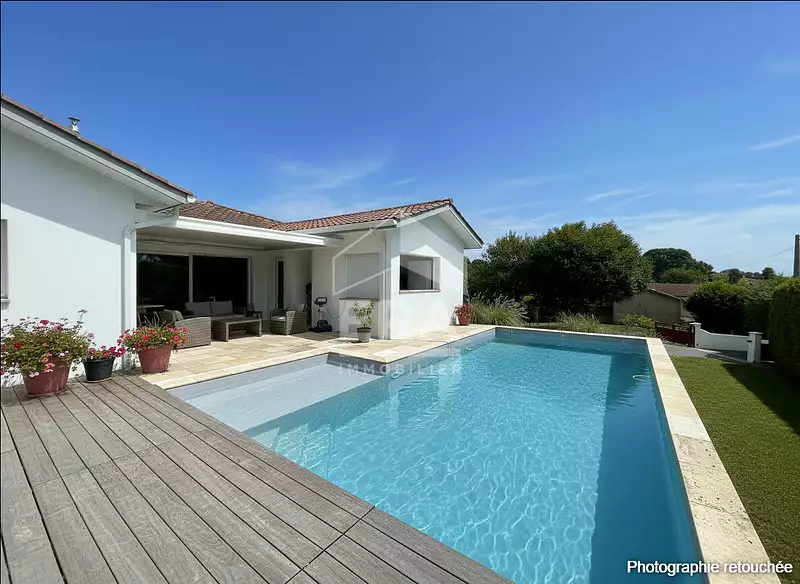 Bardos - Maison à Vendre - Découvrez cette superbe maison familiale offrant une vaste pièce de vie lumineuse, avec cuisine entièrement équipée ouverte sur la salle à manger et donnant accès à une agréable terrasse couverte bordant la piscine chauffée et son pool house.