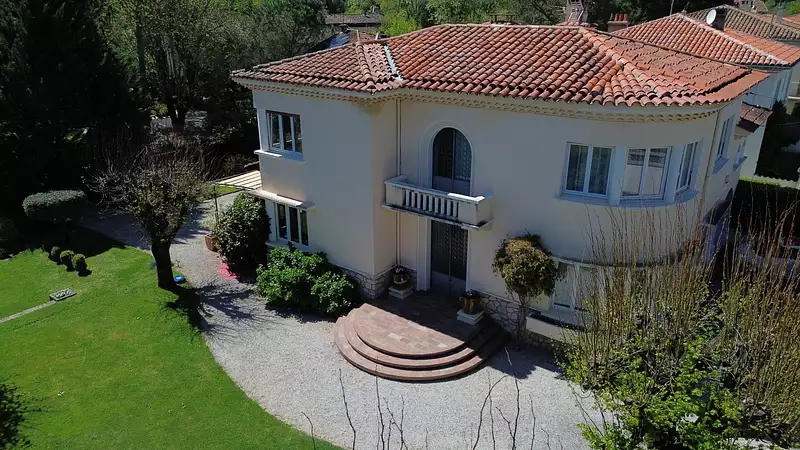 Proche du centre ville, posée sur un joli parc arboré et clos, cette maison bourgeoise des années 50 se compose en rez-de-chaussée, d'un grand salon lumineux avec insert, d'une cuisine dînatoire équipée donnant accès à une véranda avec cheminée. Egalement en rdc, un bureau d'une surface de 15 m2. A l'étage, un hall climatisé dessert 3 belles chambres sur parquet d'origine, une suite parentale et une salle d'eau. Belles prestations, matériaux de qualité. Une terrasse, un garage et une dépendance complètent l'ensemble.