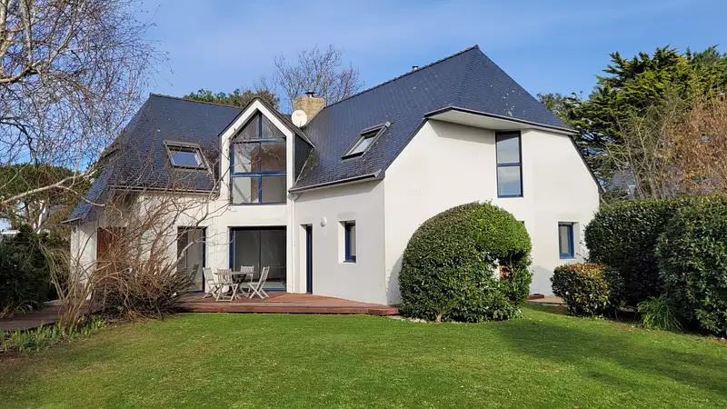 Située dans un quartier résidentiel recherché, à seulement 100 mètres de la mer et des plages du Cabellou, cette maison d'architecte de 170 m² habitables vous séduira par son environnement exceptionnel. Édifiée sur un magnifique terrain paysagé de 1 500 m², elle bénéficie d'une exposition plein sud avec terrasse et piscine. Dès l'entrée, vous découvrirez une vaste pièce de vie baignée de lumière, agrémentée d'une cheminée à insert bois, une cuisine indépendante aménagée et équipée, ainsi qu'une grande arrière-cuisine avec buanderie et chaufferie. Le rez-de-chaussée comprend également une chambre, une salle de bains avec WC, et un spacieux garage de 33 m². A l'étage, une grande mezzanine distribue trois chambres, dont une avec salle d'eau privative, et deux aménagées avec espace bureau et rangements. Une seconde salle de bains et des WC complètent ce niveau. Un bien rare sur le marché, alliant confort, luminosité et emplacement privilégié. (3.00 % honoraires TTC à la charge de l'acquéreur.)