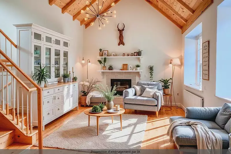 Sur la droite, vous accédez à un grand salon cathédrale chauffé par une cheminée, un escalier mène à une mezzanine avec espace nuit possible, espace détente ou bureau donnant accès aux combles.