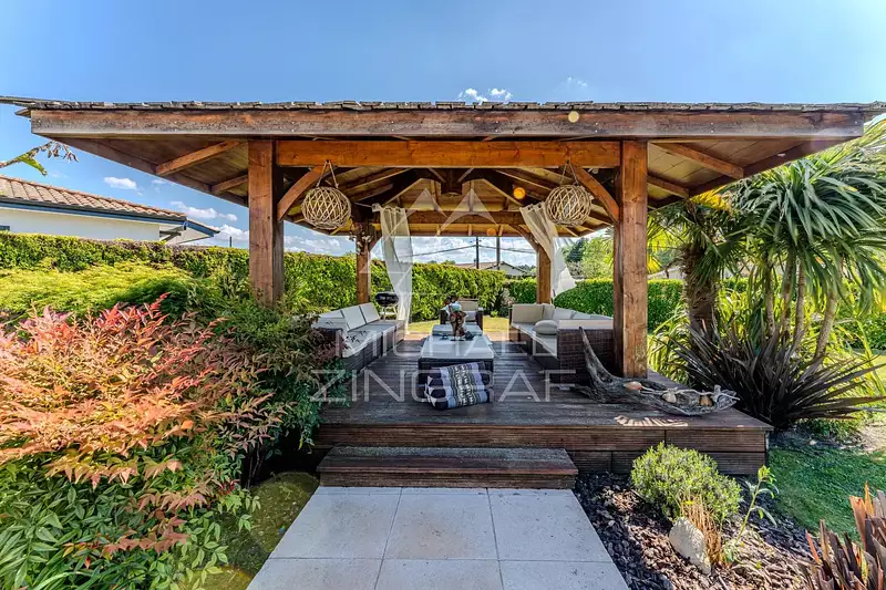 À l’extérieur, la piscine chauffée au sel de 10 x 9 mètres s’intègre harmonieusement à l’environnement paysager, et s’accompagne d’un élégant salon extérieur couvert, inspiré de l’architecture balinaise. Véritable invitation à la détente, cet espace est pensé comme un refuge de bien-être, entre ombre et lumière, idéal pour des moments de repos ou de réception dans une ambiance exotique.