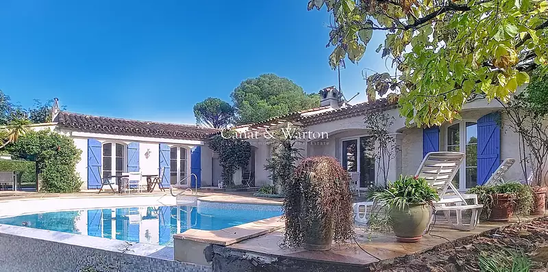 villa avec piscine living de 51 m² 4 chambres dont une suite de 32 m² cuisine ouverte sur salle à manger grandes baies panoramiques climatisation réversibles forage arrosage automatique aucun vis à vis secteur très au calme et sécurisé jardin aménagé l'ensemble exposé au sud les commerces a sont 2000 mètres