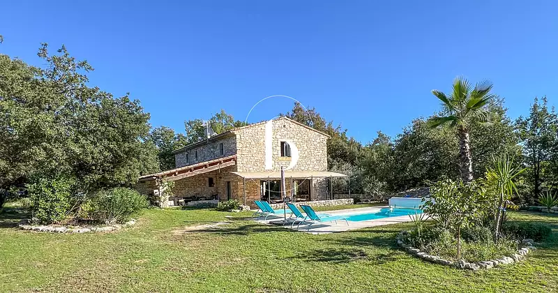 Entre Gorges de l'Ardèche et de la Cèze... Au calme, Propriété nichée au cœur d'un cadre paisible et boisé Une confortable parcelle de terrain attenant d'environ 1,5 hectares joliment arboré avec chênes truffiers et joliment paysagé, agrémenté d'un bel espace de détente avec piscine sécurisée avec rideau automatique. Une spacieuse cour intérieure ou trône fièrement un olivier en position centrale, portée par de confortables murs de soutement en pierre de pays. Venez découvrir cette charmante demeure en pierre offrant environ 170m² entièrement rénovée avec des matériaux de qualité, alliant l'authenticité du charme provençal et le confort moderne. Au rez-de-chaussée, une belle pièce à vivre avec travertin comprenant une cuisine équipée et meublée ouverte sur une salle à manger et salon avec poele à bois, le tout desservant par de belles ouvertures vitrées, de belles terrasses à l'extérieur en travertin également. A la suite, une arrière cuisine buanderie, une chambre en suite avec salle d'eau, douche italienne et toilettes suspendues. A l'étage, une deuxième grande chambre en suite avec douche italienne, 2 chambres, un bureau, une salle de bain et toilettes séparées. Chauffage par climatisations et poêle à bois. Double vitrage aluminium anthracite de qualité. Côté pratique, une pièce à usage de stockage donnant sur la cour intérieure et garage couvert d'environ 40m² pour deux véhicules. Terrasses couvertes et pergola. Portail électrique. Maison raccordée à un puits - forage avec pompe et surpresseur. Wifi avec amplificateur 4G. Votre conseiller Julien BOTELLA (0678945908). Honoraires à charge du vendeur. Un bien sélectionné par Botella et fils immobilier à Uzès, Barjac et Goudargues. Ref 855 BF