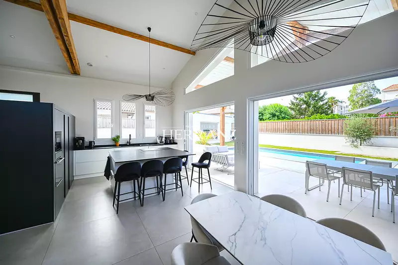 Dès l’entrée, vous serez séduits par une vaste pièce de vie de 56 m2 au plafond cathédrale, conférant volume et caractère à cet espace lumineux et chaleureux. La cuisine contemporaine, entièrement équipée et ouverte sur le séjour, s’intègre harmonieusement dans cet espace de vie baigné de lumière grâce à deux larges baies vitrées à galandage, offrant un accès direct à la terrasse couverte et à la piscine.