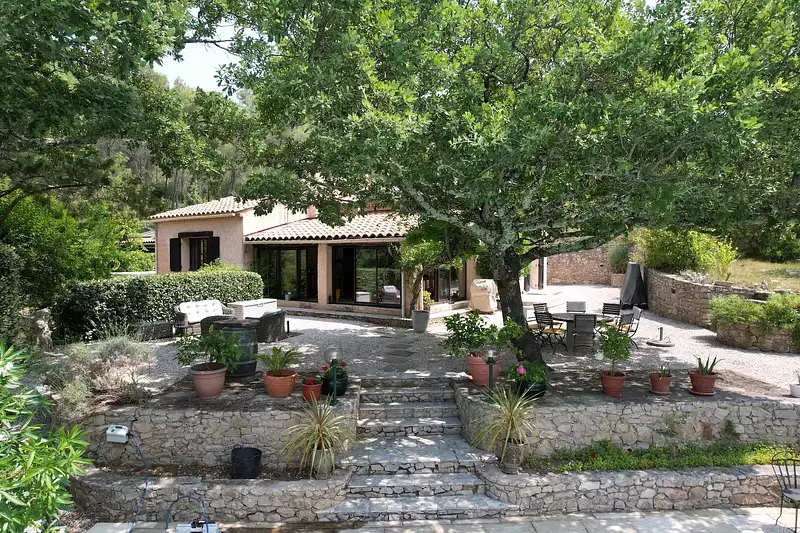MAISON CABASSE - CALME ABSOLU, LUMIERE et INTIMITE au cœur de la Provence Verte, dans un village typique, maison provençale de caractère implantée au cœur d'un parc arboré de 15 000 m² planté de nombreuses essences méditerranéennes. En position dominante, sans vis-à-vis, elle offre une vue panoramique exceptionnelle sur l'ensemble de la campagne environnante. Maison de plain-pied avec deux mezzanines, haut de plafond. Belle entrée avec rangements, confortable pièce à vivre lumineuse avec cheminée à insert et cuisine ouverte récente entièrement équipée s’ouvrant sur une large terrasse / véranda au sud avec barbecue. Véritable pièce à vivre avec vue panoramique sur le village et campagne environnante. Spacieuse mezzanine faisant office d’espace bureau et dominant le salon, 1 suite parentale s’ouvrant sur une terrasse privative au sud. Sur l’autre aile de la maison : hall avec rangements, 2 grandes chambres dont une avec mezzanine permettant des couchages supplémentaires, salle de bains avec wc. Piscine à débordement chauffée (11 x 5 m) avec vue dégagée sur le village et les collines. Terrain de pétanque. 1 agréable chambre indépendante en rez-de-jardin avec salle d’eau et wc, idéale pour recevoir de la famille, des amis, fille au pair… Cave et atelier. Garage indépendant (prise pour voiture électrique). Abri pour 2 voitures (prise pour voiture électrique), panneaux solaires, fibre optique, climatisation réversible… Maison lumineuse, beaux volumes, harmonieux, combinant le moderne et l’ancien. Excellent rapport locatif saisonnier possible. Calme absolu, accès facile à l'autoroute A8 en 20 minutes. Amateurs de nature, d'espace et de tranquillité, contactez-nous pour organiser une visite et découvrir ce havre de paix à Cabasse. Les informations sur les risques auxquels ce bien est exposé sont disponibles sur le site Géorisques : georisques.gouv.fr