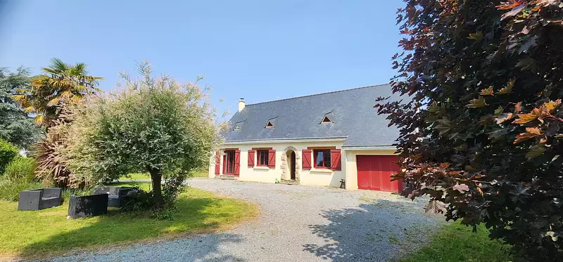 En campagne de Châteaubriant à seulement 2 min du bourg, cette charmante maison familiale édifiée sur 7000m² de terrain arboré se compose d'une entrée, grande pièce de vie, cuisine, couloir, bureau, salle de bains, salle d'eau, 5 chambres dont 2 en rez-de-chaussée, WC, salle de jeu, garage, buanderie, véranda, grenier, cave à vin. Les fruitiers sont nombreux, il y a un puits et un atelier sur le terrain.