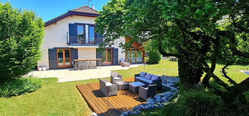 Nichée dans un hameau paisible aux abords d'Excenevex, cette propriété se distingue par son cadre privilégié et son grand jardin de 1 186 m², entièrement à l'abri des regards. Plusieurs terrasses permettent de profiter du plein air et de la luminosité tout au long de la journée.