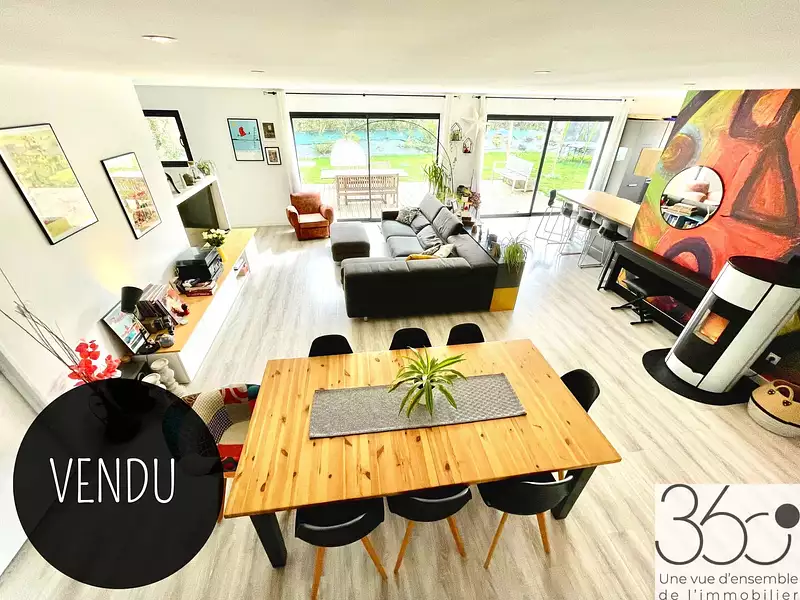 De l'entrée avec wc indépendant, nous accédons au vaste séjour contemporain, baigné de lumière d'environ 70m2 avec son poêle à granulés, sa cuisine ouverte et équipée et son cellier attenant.