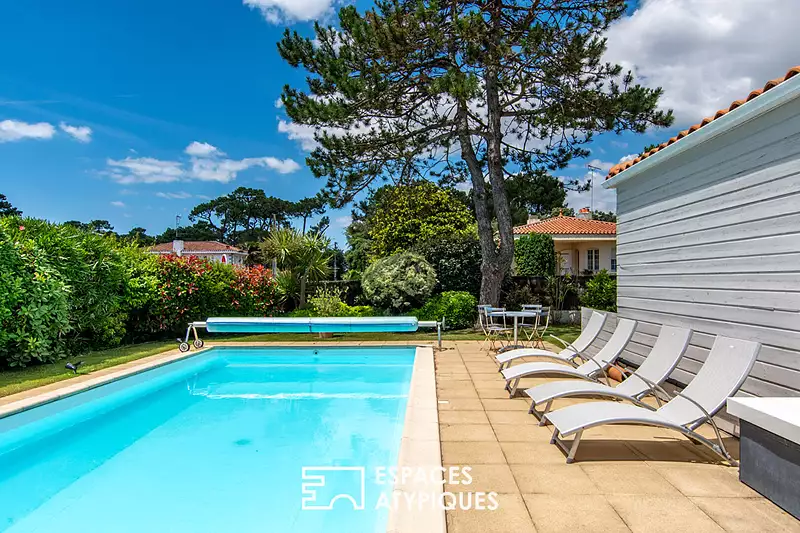 Dans le cadre enchanteur de La Pironnière, cette maison d'architecte unique, édifiée en 1980, s'étend sur 170m² de plain-pied. Située à quelques pas des commerces et des sentiers côtiers, cette maison est parfaite pour ceux qui rêvent de balades en bord de mer et d'une vie paisible au coeur de la nature. Dès l'entrée, la magie opère : la lumière traverse généreusement les vastes ouvertures, illuminant une pièce de vie ouverte sur la nature environnante, où les chênes verts se dressent fièrement. Ici, chaque instant passé dans le salon avec sa cheminée ou la cuisine semi-ouverte évoque des soirées chaleureuses et conviviales. La suite parentale, se trouve à l'écart, assurant une intimité totale. L'autre aile de la maison, avec ses deux chambres partageant une salle de bain et une autre chambre parentale avec salle de douche, offre un espace confortable et indépendant pour chaque membre de la famille. A l'extérieur, le jardin est un véritable havre de paix. La piscine, baignée de soleil, promet des moments rafraîchissants lors des chaudes journées estivales. Une terrasse d'été invite à profiter des repas en plein air. Une buanderie, cave et un garage fermé, ajoutent une touche de commodité à cette propriété d'exception. CLASSE ÉNERGIE : D / CLASSE CLIMAT D Montant moyen estimé des dépenses annuelles d'énergie pour un usage standard, établi à partir des prix de l'énergie de l'année 2021 : 1860 euros et 2580 euros Contact (EI) : Nathalie Fayat 07 86 61 96 35 Agent commercial immatriculé au RSAC de LA ROCHE-SUR-YON sous le numéro 2020AC00187. Les honoraires sont à la charge vendeur. Les informations sur les risques auxquels ce bien est exposé sont disponibles sur le site Géorisques : www.georisques.gouv.fr Nathalie FAYAT (EI) Agent Commercial - Numéro RSAC : 887 946 424 - LA ROCHE SUR YON.