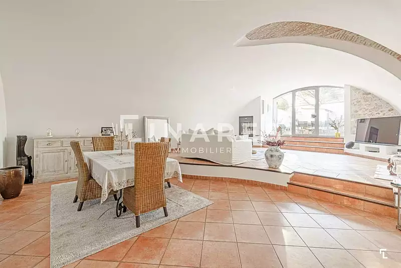 LA SINGULIERE - Maison T5 de 170m2 - Piscine - Parcelle 305m2 - 13009 LE CABOT Llinares immobilier vous propose : La singulière, une élégante maison de type 5 de 170 m², nichée au fond d'une impasse dans le très recherché quartier du Cabot, offrant un cadre de vie paisible, tout en restant proche des commerces, écoles et transports. Entièrement repensée par un architecte, cette demeure spacieuse et baignée de lumière se déploie sur deux niveaux avec au rez-de-chaussée, une vaste pièce de vie climatisée, orientée sud-est, séduit par son plafond voûté, ses parements en pierre et sa cheminée. Cet espace convivial rassemble une cuisine équipée, une salle à manger et un salon mis en lumière par une grande baie vitrée, épousant les courbes du plafond, ouvrant sur l'extérieur ou se trouve une terrasse en pierre de Rognes, une pergola en fer forgé et une belle piscine habillée de teck. Une cuisine d'été, avec four à pizza et barbecue, complète l'ensemble pour des moments de détente et de partage. À l'étage, le coin nuit, entièrement parqueté, se compose de quatre chambres dont une avec sa propre salle d'eau avec douche à l'italienne en béton ciré et double vasque. Les trois autres se partageront une salle de douche contemporaine avec WC.