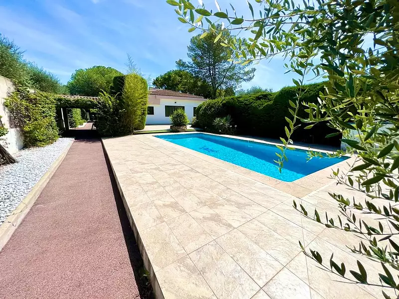 MOUGINS IN A GREEN SETTING CLOSE TO THE OLD VILLAGE BRIGHT 4/5-ROOM SINGLE STOREY VILLA SOUTH/SOUTH WEST ORIENTATION FITTED KITCHEN AND EQUIPPED WITH NUMEROUS DRESSING ROOM INTEGRATED REVERSIBLE AIR CONDITIONING DOUBLE GLAZING 3 BEDROOMS WITH BATHROOM ITALIAN SHOWER OVERLOOKING GREENERY, MASTER BEDROOM WITH DRESSING ROOM LARGE BATHROOM WITH BATHTUB DOUBLE WASHBASINS OVERLOOKING GARDEN & TERRACE, LIVING ROOM DINING ROOM OF 87m2 SOUTH/SOUTH WEST WINDOWS 6 METERS DOUBLE EXIT TO HEATED SWIMMING POOL WITH 160m2 TERRACES & FLAT LAND OF 1400m2 WITH 50-YEAR-OLD PINES AND OLIVE TREES AND MEDITERRANEAN ESSENCES WITH BOWLING PITCH PARKING FOR 7 CARS GARDEN SHELTER + COVERED PARKING: CAR PARK AND CELLAR OF 50m2 POSSIBLE SAUNA & HAMMAM POSSIBLE EXTENSION OF 38M2 SEE ON THE FLOOR WITH SEA & ESTERE OVERVIEW, CENTRALIZED HOME AUTOMATION ALARM, MAINS DRAINAGE MANDATE 1542 PRICE 1649999€ FAI RIVIERA IMMO 9 ROND POINT DUBOYS D'ANGERS AND 32 AV DE LATTRE DE TASSIGNY CANNES 0676884322 FREE AND CONFIDENTIAL ESTIMATE