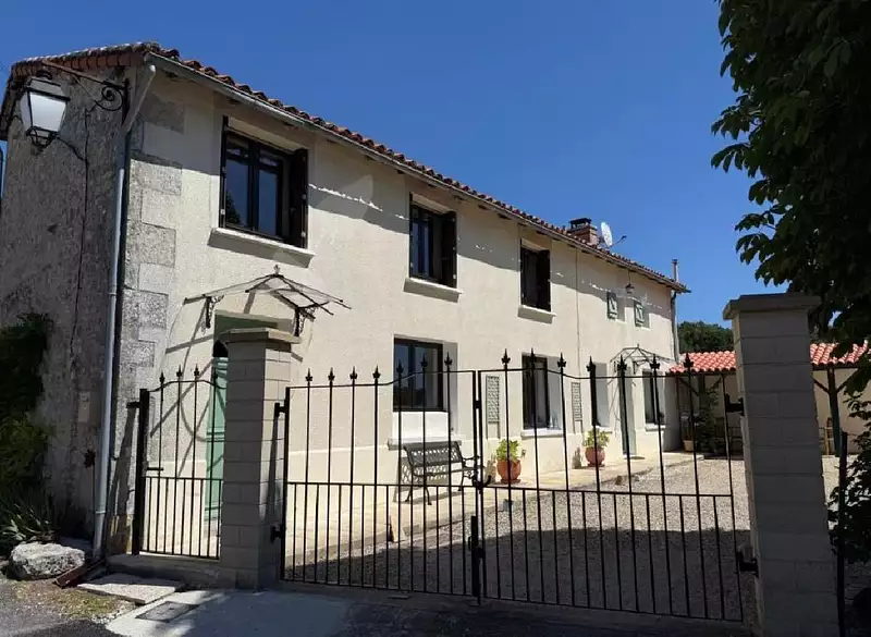 Fiche Id-SUP176273 : À seulement 7 minutes du charmant village de Nanteuil-en-Vallée, cette belle maison de campagne allie caractère authentique et confort moderne.Avec ses éléments d’origine soigneusement conservés, une décoration réalisée avec goût et une atmosphère chaleureuse, cette propriété séduira les amate urs de charme et de tranquillité. Lumineuse et spacieuse, elle offre trois belles chambres, dont une suite parentale avec salle d’eau attenante. La cuisine et le salon bénéficient d’un chauffage au sol, idéal pour des hivers confortables autour du poêle à bois. Des radiateurs électriques récents complètent le système de chauffage pour un confort optimal.À l’extérieur, profitez de vues panoramiques sur la campagne environnante. Et pour une touche originale : un parcours de golf privé 2 trous, parfait pour se détendre ou accueillir des invités.Un bien rare, alliant authenticité, confort et originalité – à ne pas manquer . Au Rez-de-Chaussée :-Entréé (9.5m²) : carrelage-Cuisine / Salle à Manger (28m²) : parquet flottant, équipée, gasinère, chauffage électrique au sol-Hall (2m²) : parque - Mentions légales : Proposé à la vente à 255300 Euros (honoraires à la charge du vendeur) - Classe Energie E : 324 kWh.m2.an - (DPE ancienne version) - Reseau Immo-Diffusion Ruffec - Pour plus d'informations, contactez notre secrétariat au 09 74 53 13 81 (Appel gratuit ou prix d'une communication locale)