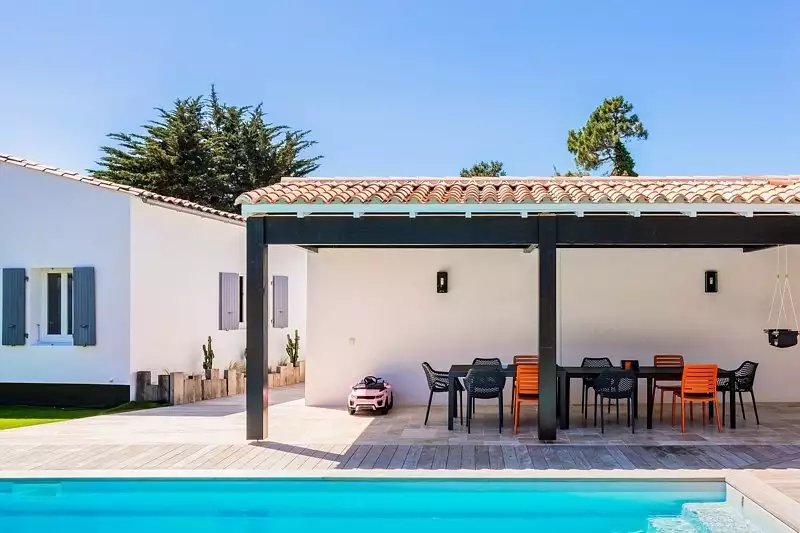 A proximité de l'océan, dans la pinède de Rivedoux et dans un environnement calme - Belle maison rénovée comprenant trois chambres sur un grand terrain d'environ 1000m² composé d'un espace piscine avec un bel espace pool house et une annexe indépendante offrant deux chambres et une pièce de vie. Grand parkingd'accueil en sus.