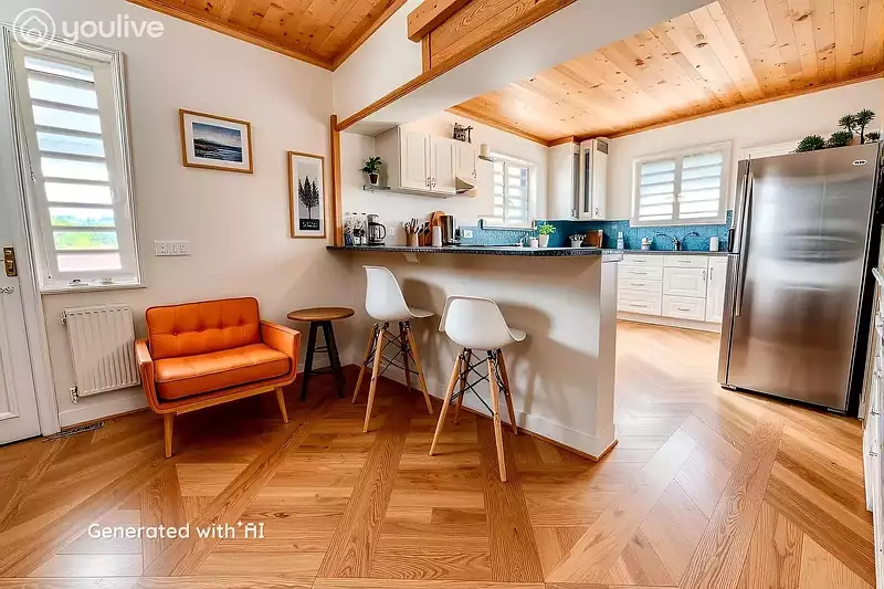 Belle pièce de vie ouverte, cuisine US actuellement en place (à personnaliser selon vos goûts)