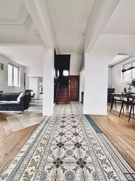 Dès l’entrée, le charme opère : sols mêlant parquet et carreaux de ciment anciens, moulures et rosaces, volumes généreux baignés de lumière. Le séjour double de 45 m2 et la vaste cuisine conviviale de 40 m2 constituent de véritables espaces de réception.