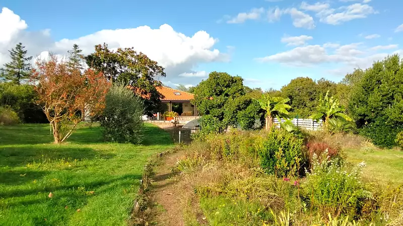 Au niveau inférieur, c'est-à-dire au sous-sol, se trouvent le garage, l'atelier et un studio de 44 m² avec une chambre et son entrée indépendante. La maison bénéficie d'une pompe à chaleur pour le chauffage et la climatisation, et de double vitrage. Le grand jardin arboré offre des vues sur la belle campagne environnante.