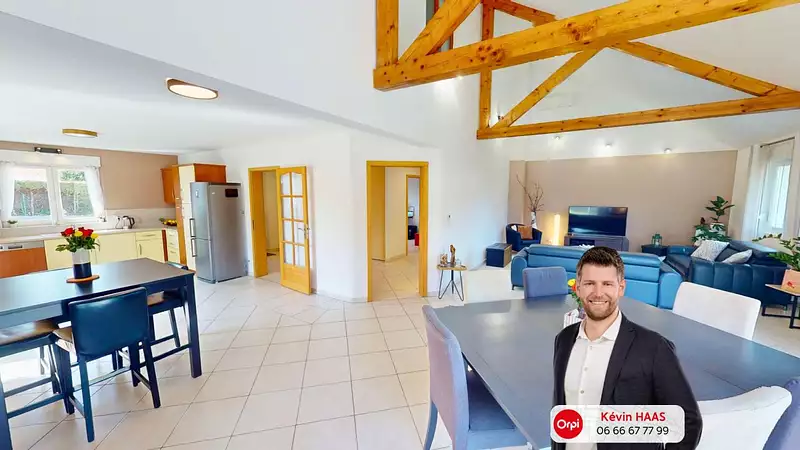Cette maison en demi-niveau dispose au rez-de-chaussée, d'une vaste entrée avec WC, un vaste espace de vie de 70 m² lumineux comprenant une cuisine ouverte sur une grande salle à manger et un salon avec une grande hauteur sous plafond, parfait pour les moments conviviaux. Vous retrouverez sur ce niveau une chambre de 12m² pouvant être utilisé en bureau ou encore en salle de jeux.