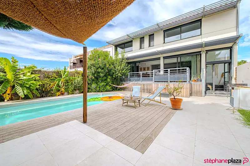 Située à 10 minutes à pied du tram et à proximité immédiate (à pieds) des commerces, cette belle et spacieuse maison mitoyenne par le garage (construction années 70, extension 2007) offre un cadre de vie idéal pour une famille, à seulement 15 minutes du centre de Montpellier. Les atouts du bien 4 chambres et 2 bureaux à l'étage; Pièce de vie lumineuse, exposée sud, avec grandes baies vitrées à galandage PVC ouvrant sur la terrasse en bois et la piscine Cuisine ouverte conviviale Jardin récent entièrement paysager et refait à neuf, avec arrosage automatique Piscine équipée d'un système de traitement et d'entretien automatique Agencement: Rez-de-chaussée : grande pièce de vie très lumineuse, avec séjour et cuisine ouverte, toilettes indépendants, débarras, garage avec espace de rangement et local technique piscine. Étage : quatre chambres dont une grande suite parentale, deux bureaux, salle de bains, salle d'eau, toilettes indépendants et palier spacieux pouvant servir de coin lecture ou de jeu. Confort et équipements: Chauffage au gaz Climatisation réversible (split) Volets roulants électriques Fibre optique Isolation double vitrage Annexes: Garage avec espace débarras Local technique dédié à la piscine Nombreux rangements Stationnement facile devant la maison Cette maison prête à vivre allie confort, modernité et emplacement privilégié, à deux pas des commerces, des écoles et des transports.
