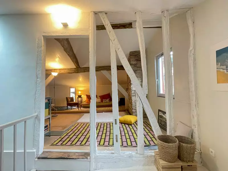 L'escalier continue vers un troisième étage où se trouve un espace fantastique dans les combles, avec une hauteur suffisante pour se tenir debout et une fenêtre d'origine dans le vieux mur médiéval en torchis. Cet espace sert actuellement de grand bureau avec petit coin cozy pour admirer la vue des toits et de la campagne environnante. Il peut également être facilement aménagé en une troisième chambre avec une salle de bain attenante, sous réserve de pouvoir connecter l'eau et les évacuations.