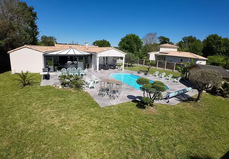 À l'extérieur, une grande terrasse carrelée entourant la piscine, avec un espace couvert. L'ensemble édifié sur une parcelle entièrement clôturée et sécurisée par un portail.