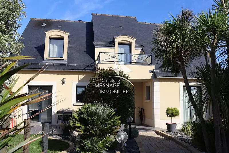 A vendre chez Christelle Mesnage Immobilier. SAINT-CAST-LE-GUILDO, à 800 mètres des plages. Belle maison contemporaine de 172m² habitables offrant au rez-de-chaussée : Une grande entrée avec placard, une cuisine équipée ouverte sur un spacieux séjour avec un poêle à bois ayant un accès à la terrasse et au jardin, une grande suite parentale avec une salle de bains avec baignoire balnéo et dressing, un bureau avec placard, un wc avec un lave-mains, une buanderie. Au 1er étage : une grande mezzanine avec une vue mer et ayant un accès à la terrasse, 3 belles chambres dont 2 avec placard et avec une vue mer, une salle d'eau, un wc. Un garage avec buanderie au sol-sol de 200m² habitables. Le tout sur un terrain clos et arboré de 923m². Coup de Coeur, Lumineuse, Beaux volumes, belles prestations, quartier résidentiel, belle vue mer de l'étage, bonne construction, à proximité des écoles, commerces et transports.