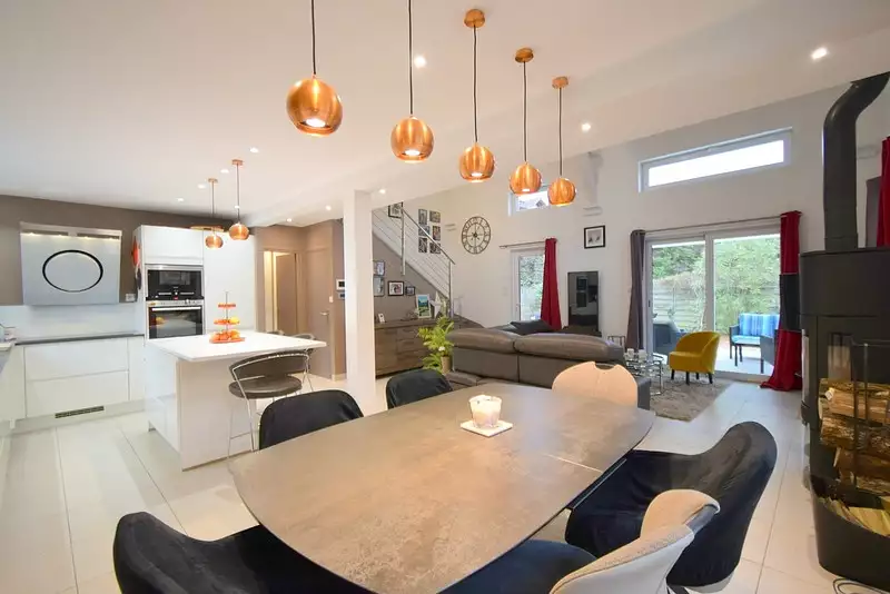La cuisine ouverte s'intègre harmonieusement au séjour et au salon cathédrale, sublimé par une belle hauteur sous plafond et un poêle à bois pour des soirées cosy.