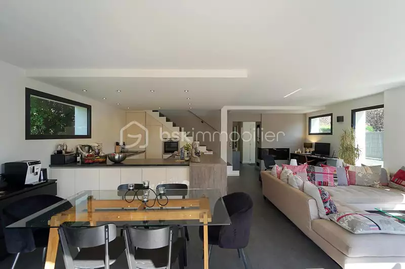 Le rez-de-chaussée s'ouvre sur une vaste pièce de vie baignée de lumière, où chaque espace est pensé avec harmonie : la cuisine ouverte, moderne et fonctionnelle, communique naturellement avec un coin bureau chaleureux animé par la cheminée, un salon convivial et un coin salle à manger accueillant. Véritable coup de cœur, la baie vitrée d'angle à ouverture totale efface la frontière entre intérieur et extérieur, prolongeant le séjour sur la terrasse, permettant de profiter de cet espace unique par tous les temps.