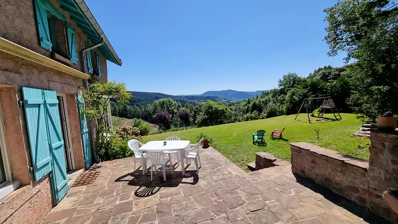 TRES RARE, dans un magnifique environnement avec vue panoramique, exposition Sud, cadre idyllique, en pleine nature proche forêt et des circuits de randonnées, maison de plus de 450 m² de surface utile avec les annexes dont 173 m² habitable sur plus de 4 hectares de terrain, comprenant hall d'entrée avec poêle à granulés ( tubage ), une salle de bains équipée avec wc, salon-séjour avec VUE PANORAMIQUE avec cheminée à l'âtre et accès terrasse, 1 chambre avec accès terrasse, salle d'eau équipée, wc, cuisine équipée et aménagée ( installée en 2024 ), à l'étage, mezzanine, 4 chambres. Buanderie-chaufferie ( chaudière fioul ). Garage. Box à chevaux. Dépendance annexe notamment bâtiment pouvant accueillir 12 chevaux en box. Terrain attenant de plus de 40000 m² dont une partie est constructible en terrain agricole et 2 carrières ( 70 m x 30 m ). Taxe foncière 2024 : 2169 euros