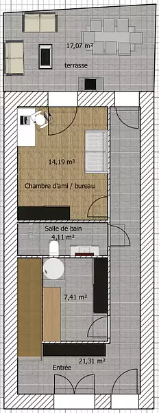 - RDC : entrée, buanderie, salle de douche/WC, chambre et terrasse
