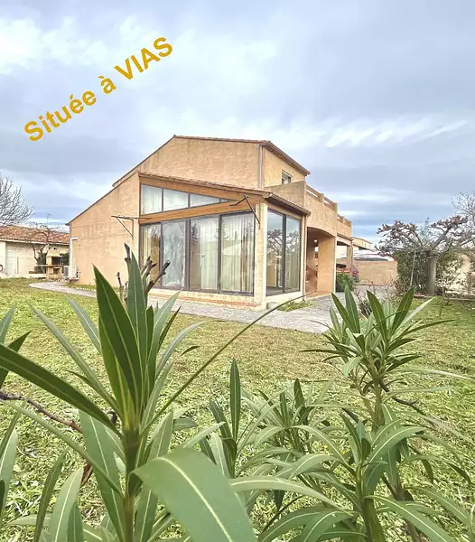 VIAS, VILLA d'environ 174 m² sur un terrain clos et arboré de 608 m² à 5mn en voiture des plages. Cette belle propriété se situe dans un endroit calme de VIAS. En franchissant le portail par une allée pavée, on accède à la villa. Au Rez-de-chaussée : Entrée avec placard et toilettes invités ouvrant sur une pièce de vie avec Cheminée, d'environ 51m² donnant sur la Véranda et la Terrasse ainsi que sur le Jardin avec un cadre verdoyant. Cuisine aménagée/équipée avec ouverture sur la pièce de vie, sur la terrase avec barbecue et le jardin, ainsi que sur l'arrière-cuisine et le débarras. Toujours au rez-de-chaussée une chambre avec placard et une salle de bains. 1er étage : Vous y trouvez un grand salon avec une belle terrasse d'environ 22 m², 2 chambres, une salle d'eau et un WC. Et les combles accessibles (servant de pièce de rangement) Garage avec porte électrique et mezzanine, d'environ 18m² (Chauffage électrique et clim réversible dans la pièce de vie, volets : roulants électriques). 174m2 véranda incluse. Bien idéalement situé dans le calme, et à proximité de tout commerce, médecins, restaurants, de l'aéroport et à 10 min de l'autoroute. Contactez votre Agent AXO - L'immobilier Actif au 06 10 03 58 01, Julieta PIRES (EI) Agent Commercial RSAC 530.453.224 Béziers. Plus d'informations sur (réf. 85002116321). Prix TTC et Honoraires à charge vendeur TTC. Les informations sur les risques auxquels ce bien est exposé sont disponibles sur le site Géorisques : https://www.georisques.gouv.fr/