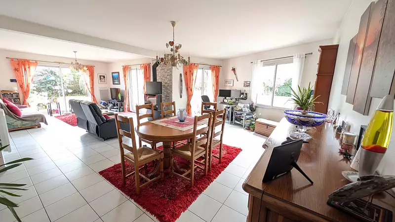 Au rez-de-chaussée, une vaste entrée lumineuse vous accueille et dessert un salon-séjour chaleureux, équipé d’un poêle à bois récent (09/2020 8,1 kW).
