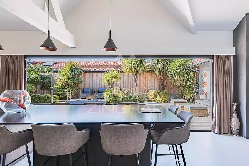 De larges baies vitrées à galandage ouvrent l’espace sur la terrasse, la piscine et la cuisine d’été, dans une continuité naturelle, sans vis-à-vis.