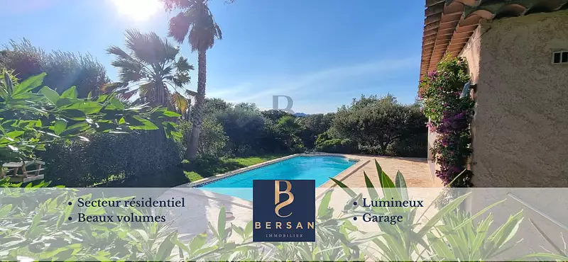 Votre agence BERSAN Immobilier à le plaisir de vous proposer, cette villa, construite par une entreprise locale de référence en la matière. Le rez-de-chaussée dispose d'un vaste séjour double, d'une cuisine indépendante aménagée et équipée, de deux chambres (de 14 et 16 m²), d'une salle de bains, de WC séparés avec lave mains et d'une spacieuse entrée. On trouve au premier étage une chambre de 38 m², une salle d'eau et un dressing, une terrasse solarium avec une vue magnifique sur la cime des pins parasols et sur le rocher de Roquebrune. Concernant les extérieurs, vous profiterez d'une terrasse ombragée, donnant sur sa belle piscine au sel, d'un jardin avec arrosage automatique et éclairages. En descendant quelques marches son espace boulodrome ombragée sera un vrai lieu de loisirs à partager entre amis ou en famille. Deux places de parking et un garage sont prévus pour stationner les véhicules. N'hésitez pas à prendre contact avec votre agence BERSAN Immobilier pour plus d'informations ou une première visite.