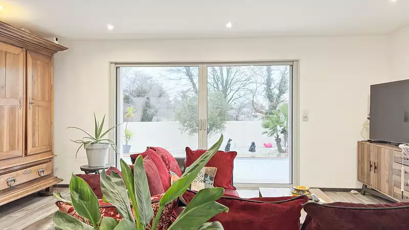 Le salon est ouvert directement sur la terrasse et la piscine.