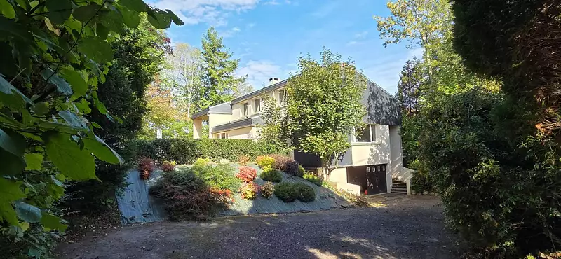 Edifiée sur un parc de 4600 m² à l'abri des regards, cette maison d'architecte vous surprendra par ses volumes et sa luminosité. Au rez-de-chaussée : Hall d'entrée sur séjour/salon de 78 m² avec accès direct sur terrasse couverte , belles hauteurs sous plafond. Cuisine, buanderie, . A l'étage, 4 belles chambres parquetées, 2 salles de bains. Sous- sol total de 80 m² à usage de garage et cave.