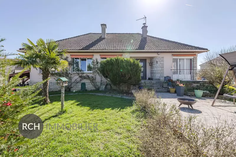 Maison familiale aux beaux volumes avec piscine d'environ 175 m2 sur beau terrain de 1544 m2 comprenant au rez-de-chaussée : entrée, grand séjour/salle à manger avec poêle à bois donnant accès sur terrasse, cuisine indépendante aménagée et équipée, trois chambres, bureau, dressing, salle de bains avec douche, WC indépendants. En-rez-de-jardin : entrée, couloir desservant deux chambres, salle de douches, chaufferie et WC indépendants, cave, grand garage pouvant accueillir trois voitures. Grenier aménageable offrant un fort potentiel d'agrandissement. Pompe à chaleur réversible.