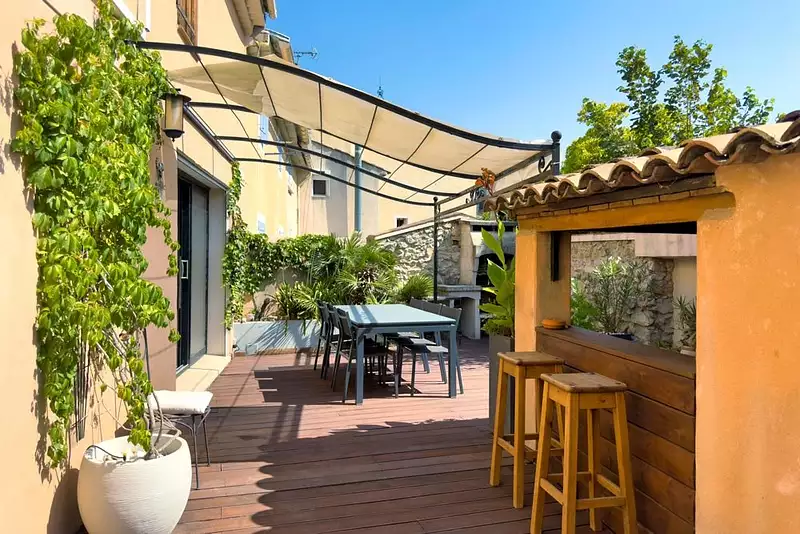 Roquevaire, quartier Pont de l'Étoile, l'agence Casaloft vous invite à découvrir une maison de village pleine de charme, avec terrasse et garage, où authenticité et confort moderne s'unissent pour offrir un cadre de vie unique. Derrière sa façade discrète, cette demeure entièrement rénovée de 175 m² habitables cache de très beaux volumes et de nombreux espaces pensés pour la convivialité comme pour l'intimité. Répartie sur 3 niveaux, elle séduit par ses volumes généreux, son caractère et son confort moderne, dans un environnement paisible et recherché. Au rez-de-chaussée, un vaste bureau de 22 m² vous accueille, parfait pour le télétravail ou une activité indépendante. Vous y trouverez également un grand dressing, une buanderie, un cellier, une salle de sport, ainsi qu'une salle de bains avec douche et baignoire. Le tout complété par un grand garage et un local technique. Au premier étage, le cœur de la maison : une pièce de vie chaleureuse de 58 m² où la cuisine haut de gamme s'ouvre sur un séjour lumineux. Poussez la baie vitrée, et vous découvrez une superbe terrasse de 50 m² en bois rouge du Brésil, avec salon et cuisine d'été couverts, un barbecue et même une douche extérieure. Un véritable coin de paradis pour partager de bons repas en famille ou entre amis, et savourer les longues soirées d'été. Une salle d'eau avec wc complète ce niveau. À l'étage supérieur, deux grandes chambres mansardées (20 m² et 22 m²), dont une avec wc et point d'eau, offrent une vue imprenable sur la campagne environnante et les collines du parc naturel régional de la Sainte-Baume. Côté confort, rien ne manque : poutres apparentes, parquet en chêne massif, poêle à granulés, climatisation réversible, cave tempérée, arrosage automatique, adoucisseur d'eau, VMC, cuisine d'été, BBQ Chaque détail a été pensé pour faciliter la vie au quotidien tout en conservant le cachet de l'ancien. Ici, tout invite à la détente et au bien-être, entre douceur de vivre provençale et modernité.