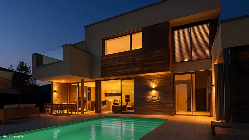 Saint-Pierre-en-Faucigny - Maison contemporaine d'architecte à toit plat végétalisé - 175 m2 - Terrain 1078 m2 - Piscine 4x9 m. Signée par une architecte reconnue et réalisée en 2019 par les meilleurs artisans locaux. Matériaux, équipements, prestations : tout relève d'un niveau d'excellence constant, du premier coup d'oeil jusqu'aux détails les plus discrets. Au rez-de-chaussée : - Entrée cathédrale - Cuisine / Séjour traversants de 50 m2 ouvert sur l'extérieur - Suite parentale lumineuse avec dressing sur mesure, salle d'eau et accès direct à la terrasse. A l'étage : - Spacieuse mezzanine - Trois chambres avec rangements - Salle de bain avec baignoire et double vasque - Solarium Extérieurs : - Terrain paysagé de 1078 m2 - Terrasse principale plein sud de 90 m2 en continuité du sol intérieur - Terrasse secondaire à l'ouest côté cuisine - Piscine chauffée de 4x9, structure béton, liner en PVC armé et avec volet roulant immergé motorisé - Local de rangement extérieur, préau pour voiture Maison disposant d'une assurance dommage-ouvrage jusqu'en 2029 Vous trouverez à proximité et accessibles à pied : école, bus, boulangerie et autres commodités à moins de 500 m. Sandrine DELAJOD (EI) Agent Commercial - Numéro RSAC : - .