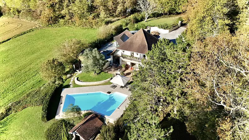 Implantée sur plus de 2 500 m² clos, à l'abri des regards et hors zone inondable, elle profite d'un horizon dégagé jusqu'à la chaîne des Pyrénées, visible depuis la terrasse et la piscine.