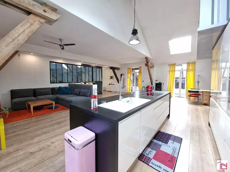 La composition du bien est faite dans une idée de volumes avec un couloir d'entrée qui vous amène vers la pièce de vie principale. Ici, une cuisine à l'américaine s'ouvre sur un grand séjour lumineux surplombé par une mezzanine en métal où se loge la chambre principale! Vue surplombant l'ensemble du logement, c'est unique!