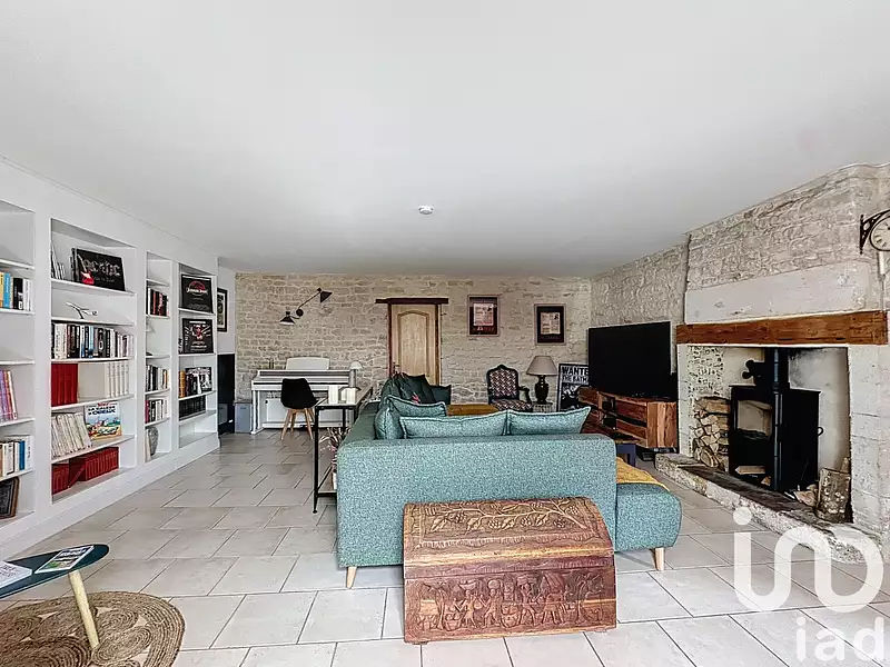 iad France - Florence Chateil vous propose: MAISON CHARENTAISE EN PIERRE - TROIS GRANDES CHAMBRES - SALON - CUISINE OUVERTE SUR SÉJOUR - DEUX POÊLES À BOIS - WC - BUANDERIE - CELLIER - BUREAU - DRESSING - COUR INTIME - AUCUN TRAVAUX À PRÉVOIR - VISITE VIRTUELLE A VOTRE DISPOSITION